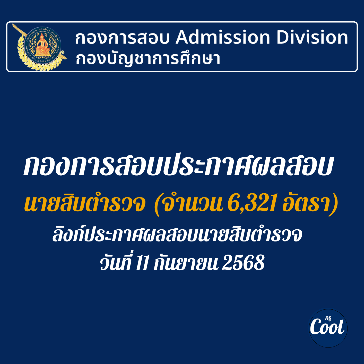 สวัสดีค่ะ วันนี้เว็บไซต์ ครูคูลดอทคอม มีเรื่องราวเกี่ยวกับ กองการสอบประกาศผลสอบ 2568 ลิงก์ประกาศผลสอบนายสิบตำรวจ ชั้นประทวน พ.ศ. 2567 รวมทั้งสิ้นจำนวน 6,321 อัตรา จะประกาศผลสอบนายสิบตำรวจ วันที่ 11 กันยายน 2568 รายละเอียดจะเป็นยังไง อ่านได้ที่นี่ค่ะ