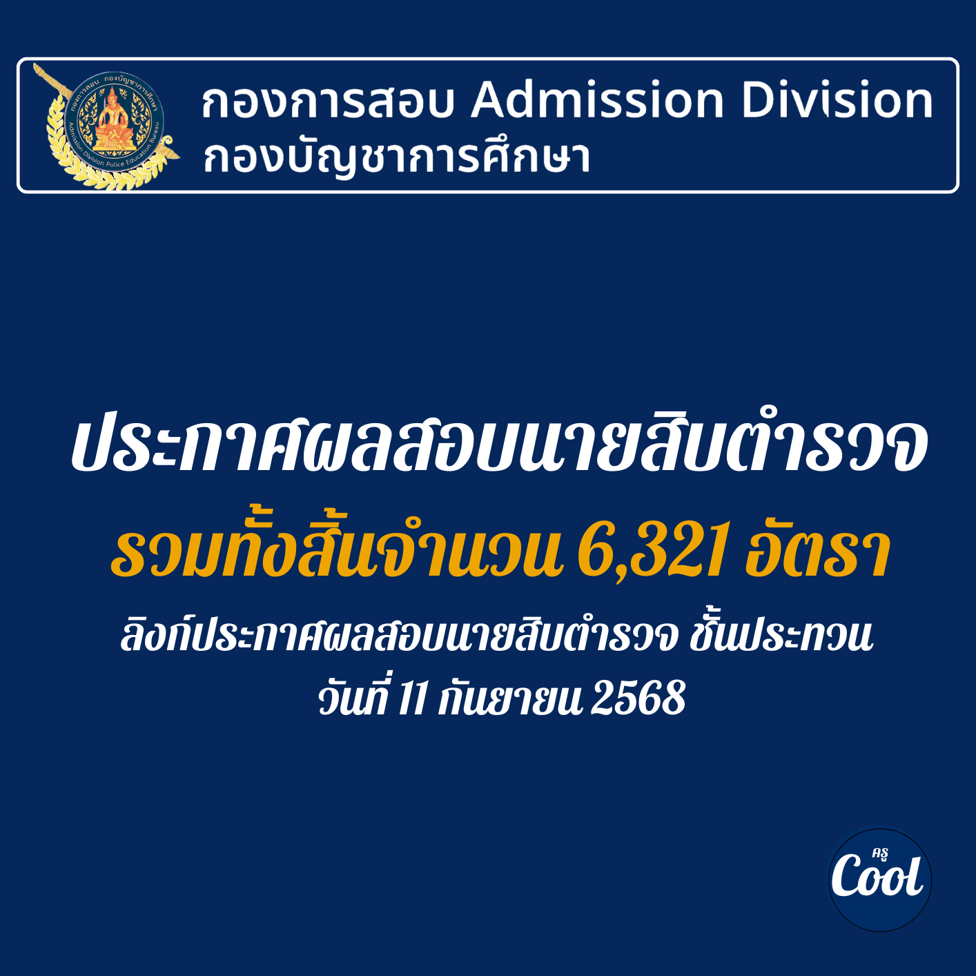 สวัสดีค่ะ วันนี้เว็บไซต์ ครูคูลดอทคอม มีเรื่องราวเกี่ยวกับ ประกาศผลสอบนายสิบตำรวจ 2568 ลิงก์ประกาศผลสอบนายสิบตำรวจ ชั้นประทวน พ.ศ. 2567 รวมทั้งสิ้นจำนวน 6,321 อัตรา จะประกาศผลสอบนายสิบตำรวจ วันที่ 11 กันยายน 2568 รายละเอียดจะเป็นยังไง อ่านได้ที่นี่ค่ะ