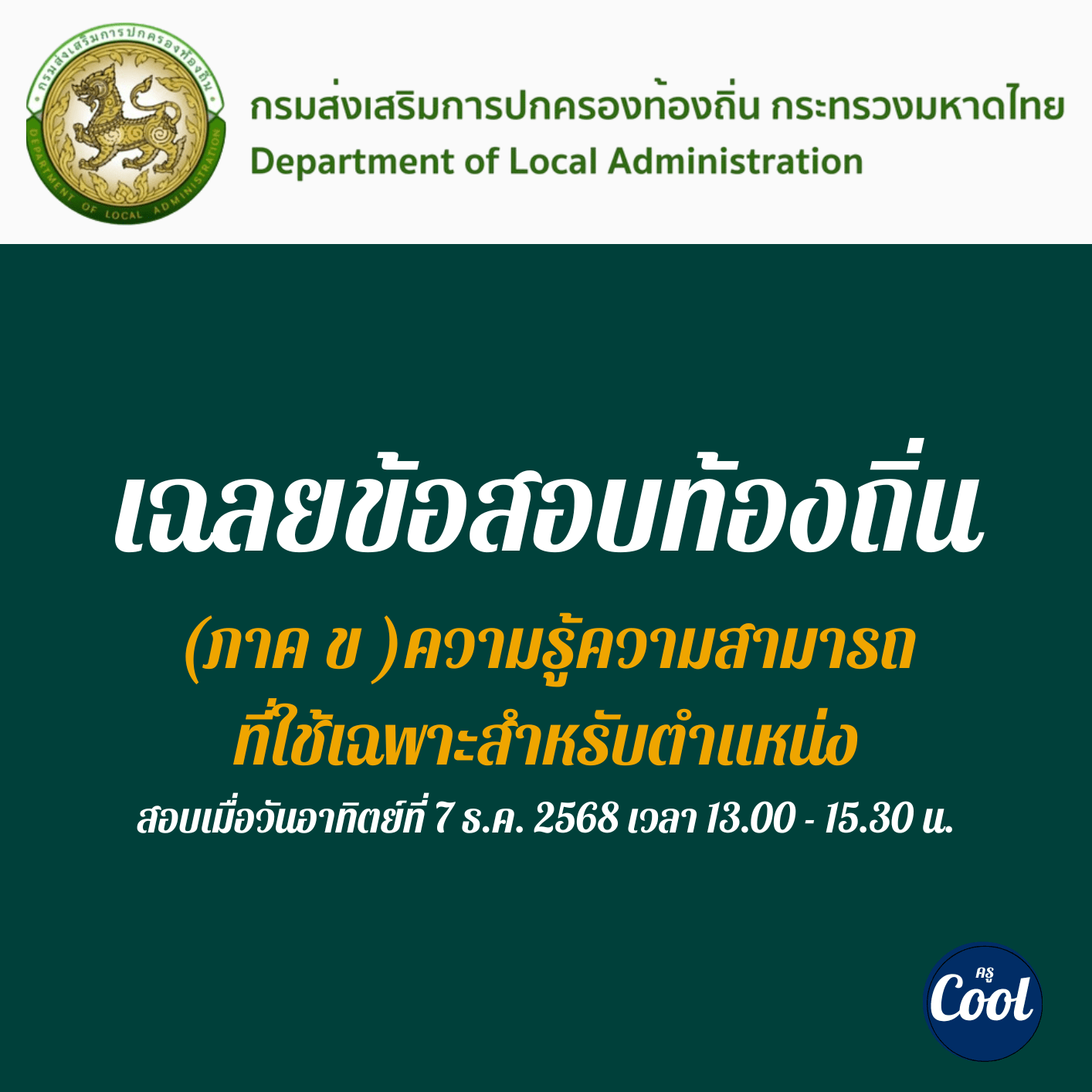 เฉลยข้อสอบท้องถิ่น 2568 (ภาค ข) ภาคความรู้ความสามารถที่ใช้เฉพาะสําหรับตําแหน่ง สอบท้องถิ่นเมื่อ วันอาทิตย์ที่ 7 ธ.ค. 2568 เวลา 13.00 – 15.30 น.